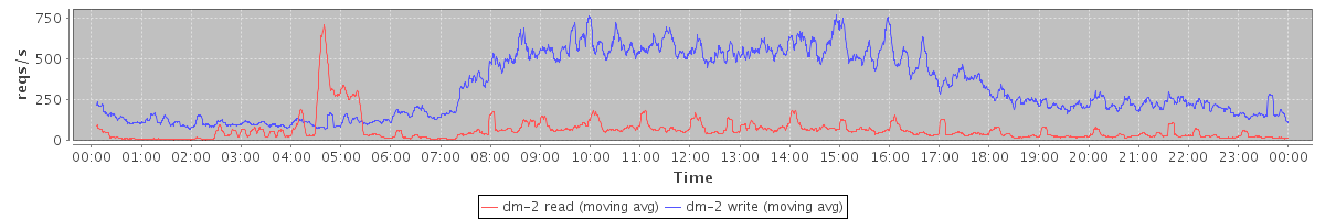 avg(dm-0 read) = 834.63 avg(dm-0 write) = 552.60
