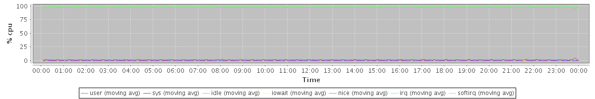avg(user) = 1.34 avg(sys) = 0.20 avg(idle) = 98.32 avg(iowait) = 0.12 avg(nice) = 0.00 avg(irq) = 0.00 avg(softirq) = 0.00