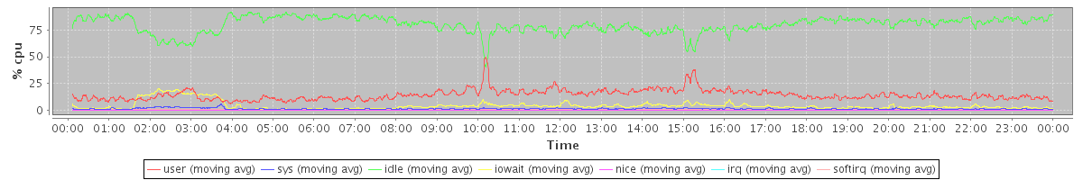 avg(user) = 14.20 avg(sys) = 1.23 avg(idle) = 79.92 avg(iowait) = 4.14 avg(nice) = 0.00 avg(irq) = 0.03 avg(softirq) = 0.47