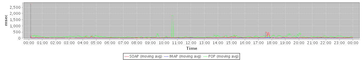 avg(BackupQueryRequest) = 892.60 avg(BrowseRequest) = 1733.00 avg(CancelAppointmentRequest) = 1259.75 avg(RemoveAttachmentsRequest) = 627.00 avg(AutoCompleteRequest) = 806.71 avg(ApplyFilterRulesRequest) = 4394.70 avg(SearchGalRequest) = 549.31 avg(BackupRequest) = 6409.00 avg(ContactActionRequest.move) = 679.00 avg(GetQuotaUsageRequest) = 1322.00