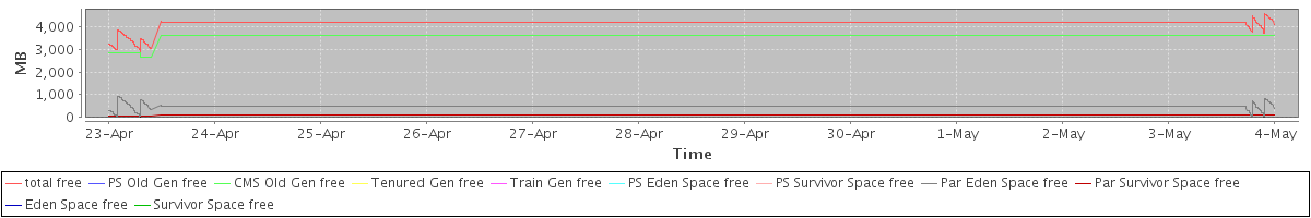avg(total free) = 3669.74 avg(PS Old Gen free) = 0.00 avg(CMS Old Gen free) = 3126.01 avg(Tenured Gen free) = 0.00 avg(Train Gen free) = 0.00 avg(PS Eden Space free) = 0.00 avg(PS Survivor Space free) = 0.00 avg(Par Eden Space free) = 469.91 avg(Par Survivor Space free) = 73.82 avg(Eden Space free) = 0.00 avg(Survivor Space free) = 0.00