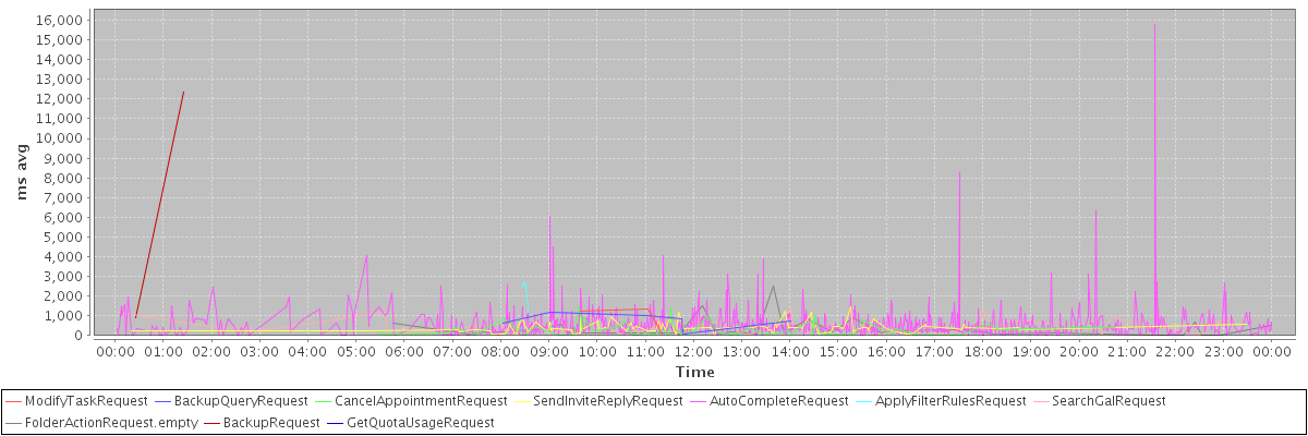 avg(ModifyTaskRequest) = 866.00 avg(BackupQueryRequest) = 742.50 avg(CancelAppointmentRequest) = 287.57 avg(SendInviteReplyRequest) = 414.70 avg(AutoCompleteRequest) = 577.88 avg(ApplyFilterRulesRequest) = 2160.25 avg(SearchGalRequest) = 422.18 avg(FolderActionRequest.empty) = 360.03 avg(BackupRequest) = 6619.50 avg(GetQuotaUsageRequest) = 1437.00