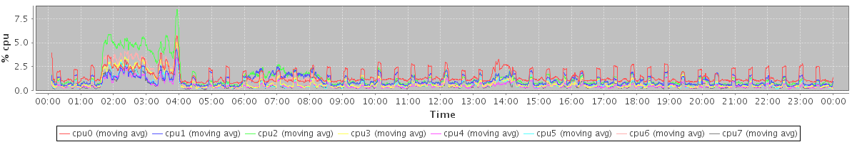 avg(cpu0) = 1.03 avg(cpu1) = 0.29 avg(cpu2) = 0.43 avg(cpu3) = 0.28 avg(cpu4) = 0.19 avg(cpu5) = 0.21 avg(cpu6) = 0.24 avg(cpu7) = 0.18