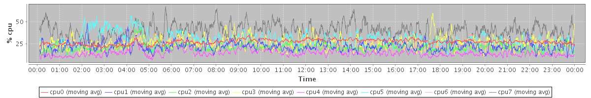 avg(cpu0) = 27.09 avg(cpu1) = 21.95 avg(cpu2) = 20.77 avg(cpu3) = 25.76 avg(cpu4) = 14.28 avg(cpu5) = 29.59 avg(cpu6) = 23.84 avg(cpu7) = 39.31