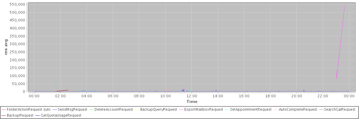 avg(FolderActionRequest.sync) = 1457.00 avg(SendMsgRequest) = 407.27 avg(DeleteAccountRequest) = 38623.50 avg(BackupQueryRequest) = 655.00 avg(ExportMailboxRequest) = 251256.00 avg(SetAppointmentRequest) = 417.65 avg(AutoCompleteRequest) = 576.39 avg(SearchGalRequest) = 447.06 avg(BackupRequest) = 5684.00 avg(GetQuotaUsageRequest) = 3856.00