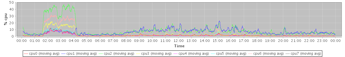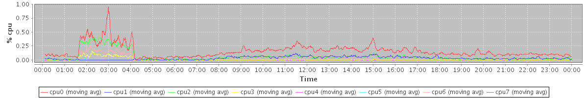 avg(cpu0) = 1.41 avg(cpu1) = 0.40 avg(cpu2) = 0.48 avg(cpu3) = 0.34 avg(cpu4) = 0.24 avg(cpu5) = 0.30 avg(cpu6) = 0.31 avg(cpu7) = 0.31