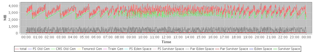 avg(total) = 3321.80 avg(PS Old Gen) = 0.00 avg(CMS Old Gen) = 2762.62 avg(Tenured Gen) = 0.00 avg(Train Gen) = 0.00 avg(PS Eden Space) = 0.00 avg(PS Survivor Space) = 0.00 avg(Par Eden Space) = 473.40 avg(Par Survivor Space) = 85.78 avg(Eden Space) = 0.00 avg(Survivor Space) = 0.00