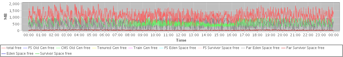 avg(total free) = 1127.25 avg(PS Old Gen free) = 0.00 avg(CMS Old Gen free) = 583.76 avg(Tenured Gen free) = 0.00 avg(Train Gen free) = 0.00 avg(PS Eden Space free) = 0.00 avg(PS Survivor Space free) = 0.00 avg(Par Eden Space free) = 504.08 avg(Par Survivor Space free) = 39.40 avg(Eden Space free) = 0.00 avg(Survivor Space free) = 0.00