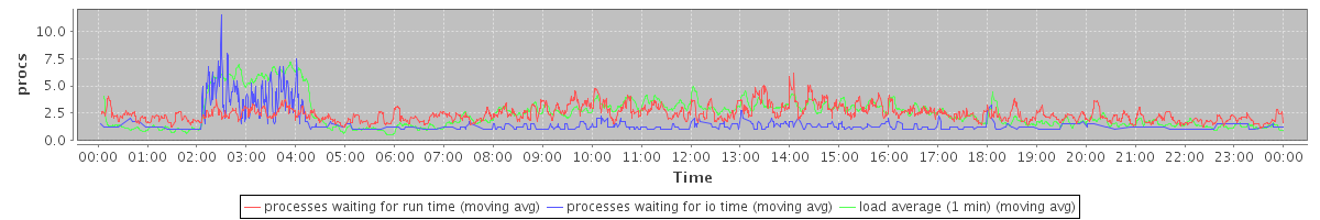 avg(processes waiting for run time) = 1.87 avg(processes waiting for io time) = 0.59 avg(load average (1 min)) = 2.49