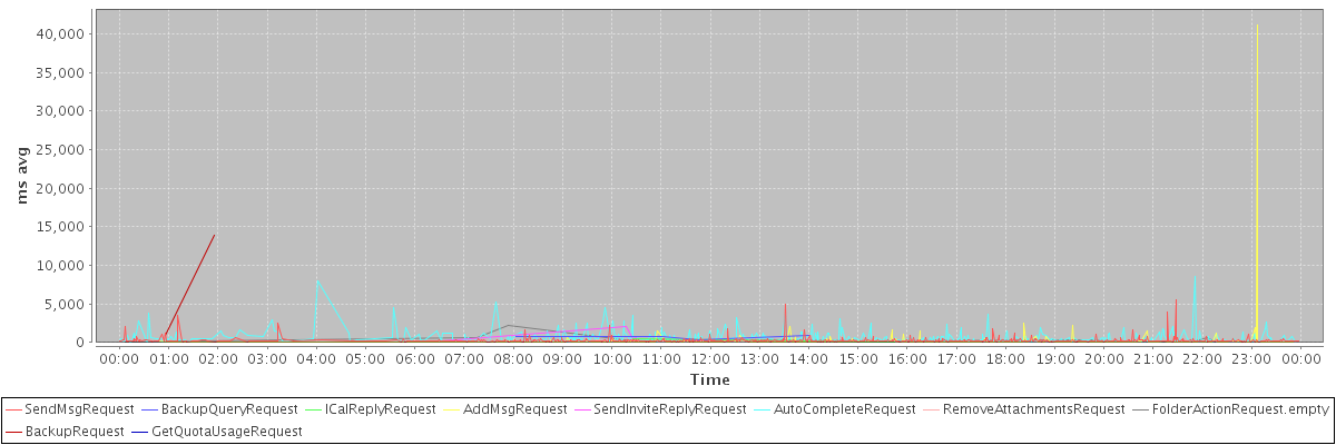avg(SendMsgRequest) = 248.57 avg(BackupQueryRequest) = 695.40 avg(ICalReplyRequest) = 235.00 avg(AddMsgRequest) = 209.45 avg(SendInviteReplyRequest) = 839.25 avg(AutoCompleteRequest) = 603.66 avg(RemoveAttachmentsRequest) = 204.07 avg(FolderActionRequest.empty) = 296.28 avg(BackupRequest) = 7416.50 avg(GetQuotaUsageRequest) = 5449.00