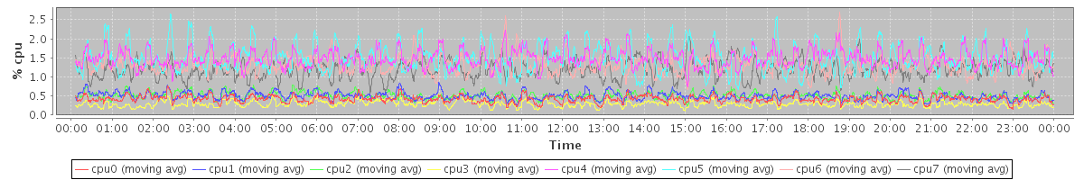 avg(cpu0) = 0.42 avg(cpu1) = 0.51 avg(cpu2) = 0.51 avg(cpu3) = 0.29 avg(cpu4) = 1.49 avg(cpu5) = 1.50 avg(cpu6) = 1.32 avg(cpu7) = 1.20