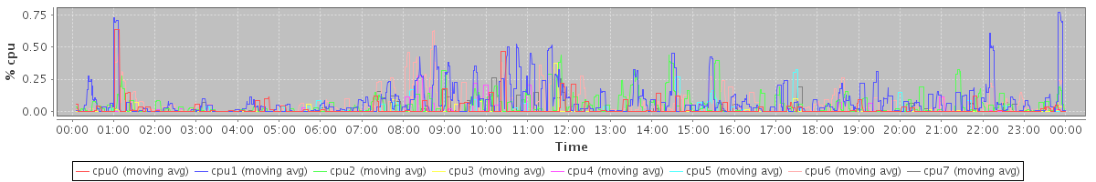 avg(cpu0) = 0.79 avg(cpu1) = 0.43 avg(cpu2) = 0.30 avg(cpu3) = 0.33 avg(cpu4) = 0.18 avg(cpu5) = 0.19 avg(cpu6) = 0.26 avg(cpu7) = 0.18