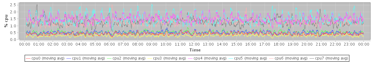 avg(cpu0) = 0.42 avg(cpu1) = 0.50 avg(cpu2) = 0.52 avg(cpu3) = 0.29 avg(cpu4) = 1.49 avg(cpu5) = 1.51 avg(cpu6) = 1.31 avg(cpu7) = 1.28