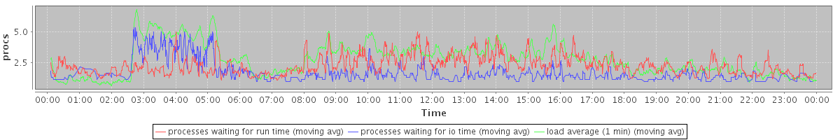 avg(processes waiting for run time) = 1.71 avg(processes waiting for io time) = 0.96 avg(load average (1 min)) = 2.77