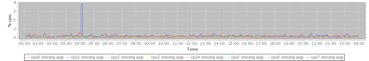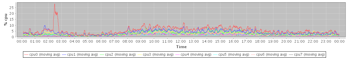avg(cpu0) = 0.12 avg(cpu1) = 0.13 avg(cpu2) = 0.04 avg(cpu3) = 0.04 avg(cpu4) = 0.03 avg(cpu5) = 0.02 avg(cpu6) = 0.02 avg(cpu7) = 0.01