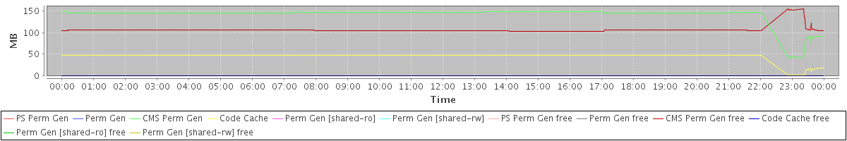 avg(PS Perm Gen) = 0.00 avg(Perm Gen) = 0.00 avg(CMS Perm Gen) = 143.75 avg(Code Cache) = 46.38 avg(Perm Gen [shared-ro]) = 0.00 avg(Perm Gen [shared-rw]) = 0.00 avg(PS Perm Gen free) = 0.00 avg(Perm Gen free) = 0.00 avg(CMS Perm Gen free) = 105.31 avg(Code Cache free) = 0.29 avg(Perm Gen [shared-ro] free) = 0.00 avg(Perm Gen [shared-rw] free) = 0.00