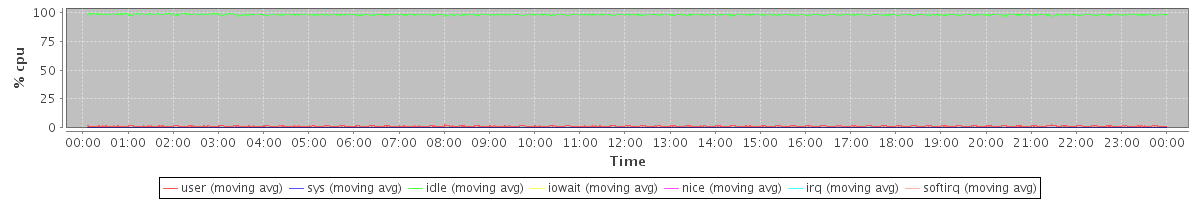 avg(user) = 1.28 avg(sys) = 0.24 avg(idle) = 98.17 avg(iowait) = 0.02 avg(nice) = 0.26 avg(irq) = 0.00 avg(softirq) = 0.00