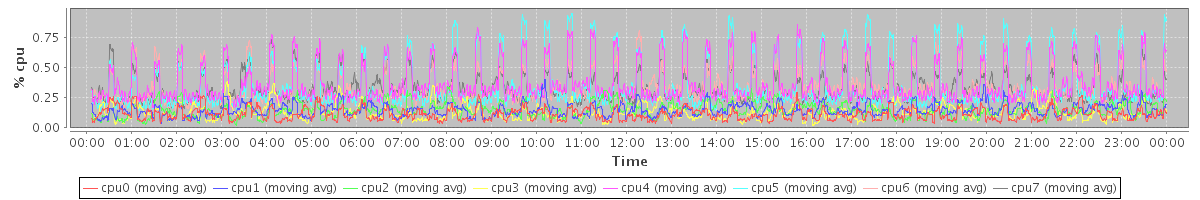 avg(cpu0) = 0.13 avg(cpu1) = 0.16 avg(cpu2) = 0.19 avg(cpu3) = 0.20 avg(cpu4) = 0.26 avg(cpu5) = 0.34 avg(cpu6) = 0.35 avg(cpu7) = 0.41