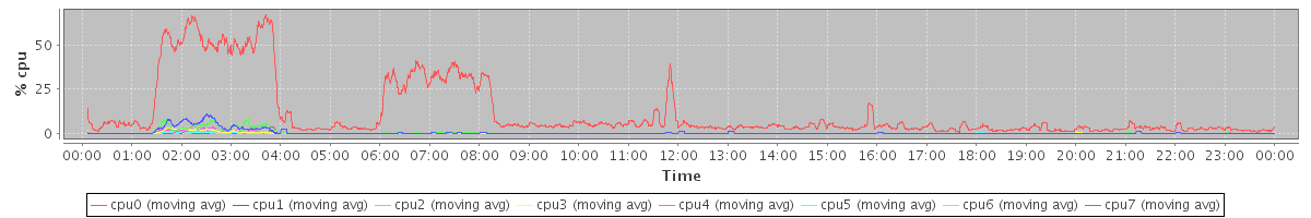 avg(cpu0) = 11.63 avg(cpu1) = 0.55 avg(cpu2) = 0.48 avg(cpu3) = 0.16 avg(cpu4) = 0.18 avg(cpu5) = 0.05 avg(cpu6) = 0.08 avg(cpu7) = 0.03