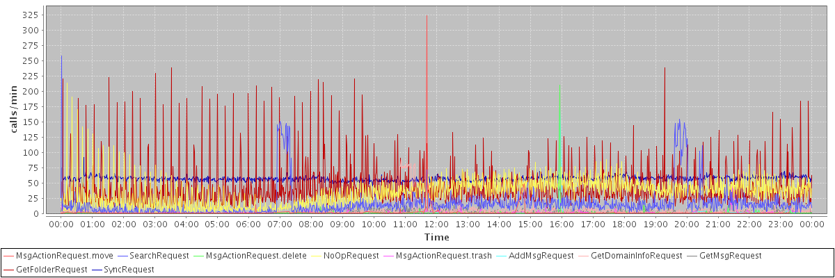 max(MsgActionRequest.move) = 324.00 max(SearchRequest) = 258.00 max(MsgActionRequest.delete) = 210.00 max(NoOpRequest) = 214.00 max(MsgActionRequest.trash) = 48.00 max(AddMsgRequest) = 174.00 max(GetDomainInfoRequest) = 88.00 max(GetMsgRequest) = 48.00 max(GetFolderRequest) = 239.00 max(SyncRequest) = 92.00