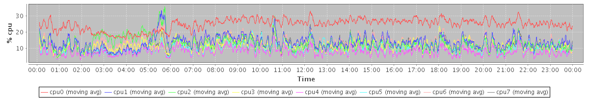 avg(cpu0) = 24.90 avg(cpu1) = 13.56 avg(cpu2) = 13.11 avg(cpu3) = 12.02 avg(cpu4) = 7.93 avg(cpu5) = 10.72 avg(cpu6) = 13.50 avg(cpu7) = 11.79