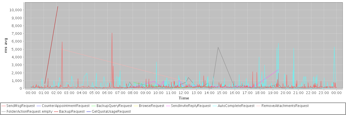 avg(SendMsgRequest) = 220.12 avg(CounterAppointmentRequest) = 138.00 avg(BackupQueryRequest) = 326.80 avg(BrowseRequest) = 181.00 avg(SendInviteReplyRequest) = 393.47 avg(AutoCompleteRequest) = 324.82 avg(RemoveAttachmentsRequest) = 1902.00 avg(FolderActionRequest.empty) = 404.67 avg(BackupRequest) = 5538.00 avg(GetQuotaUsageRequest) = 1445.00