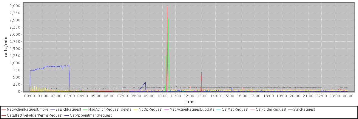 max(MsgActionRequest.move) = 2973.00 max(SearchRequest) = 922.00 max(MsgActionRequest.delete) = 2553.00 max(NoOpRequest) = 213.00 max(MsgActionRequest.update) = 43.00 max(GetMsgRequest) = 52.00 max(GetFolderRequest) = 191.00 max(SyncRequest) = 185.00 max(GetEffectiveFolderPermsRequest) = 37.00 max(GetAppointmentRequest) = 321.00