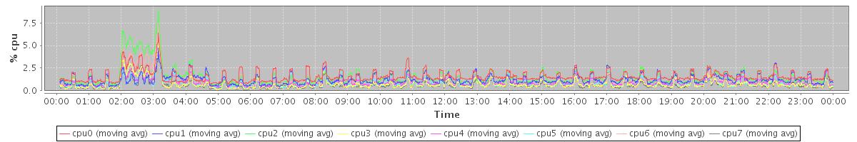 avg(cpu0) = 1.14 avg(cpu1) = 0.66 avg(cpu2) = 0.68 avg(cpu3) = 0.49 avg(cpu4) = 0.69 avg(cpu5) = 0.71 avg(cpu6) = 0.68 avg(cpu7) = 0.65