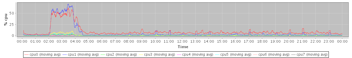 avg(cpu0) = 0.11 avg(cpu1) = 0.18 avg(cpu2) = 0.03 avg(cpu3) = 0.03 avg(cpu4) = 0.02 avg(cpu5) = 0.03 avg(cpu6) = 0.03 avg(cpu7) = 0.02