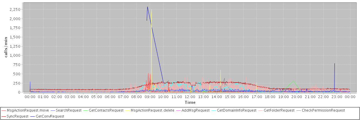 max(MsgActionRequest.move) = 513.00 max(SearchRequest) = 289.00 max(GetContactsRequest) = 311.00 max(MsgActionRequest.delete) = 2250.00 max(AddMsgRequest) = 243.00 max(GetDomainInfoRequest) = 299.00 max(GetFolderRequest) = 497.00 max(CheckPermissionRequest) = 385.00 max(SyncRequest) = 304.00 max(GetConvRequest) = 2324.00