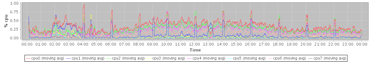 avg(cpu0) = 1.24 avg(cpu1) = 0.77 avg(cpu2) = 0.84 avg(cpu3) = 0.48 avg(cpu4) = 0.76 avg(cpu5) = 0.34 avg(cpu6) = 0.46 avg(cpu7) = 0.26