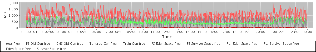avg(total free) = 1017.95 avg(PS Old Gen free) = 0.00 avg(CMS Old Gen free) = 495.23 avg(Tenured Gen free) = 0.00 avg(Train Gen free) = 0.00 avg(PS Eden Space free) = 0.00 avg(PS Survivor Space free) = 0.00 avg(Par Eden Space free) = 483.95 avg(Par Survivor Space free) = 38.77 avg(Eden Space free) = 0.00 avg(Survivor Space free) = 0.00