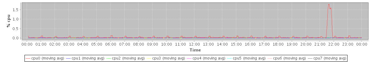 avg(cpu0) = 1.79 avg(cpu1) = 1.52 avg(cpu2) = 1.22 avg(cpu3) = 1.23 avg(cpu4) = 1.13 avg(cpu5) = 1.11 avg(cpu6) = 1.18 avg(cpu7) = 1.13