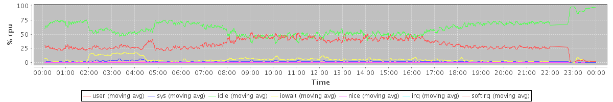 avg(user) = 32.05 avg(sys) = 1.63 avg(idle) = 60.14 avg(iowait) = 5.20 avg(nice) = 0.00 avg(irq) = 0.05 avg(softirq) = 0.94