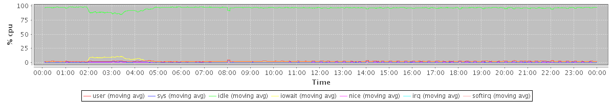 avg(user) = 1.91 avg(sys) = 0.36 avg(idle) = 96.21 avg(iowait) = 1.38 avg(nice) = 0.10 avg(irq) = 0.00 avg(softirq) = 0.04