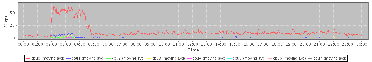 avg(cpu0) = 0.24 avg(cpu1) = 0.02 avg(cpu2) = 0.18 avg(cpu3) = 0.02 avg(cpu4) = 0.14 avg(cpu5) = 0.01 avg(cpu6) = 0.06 avg(cpu7) = 0.00