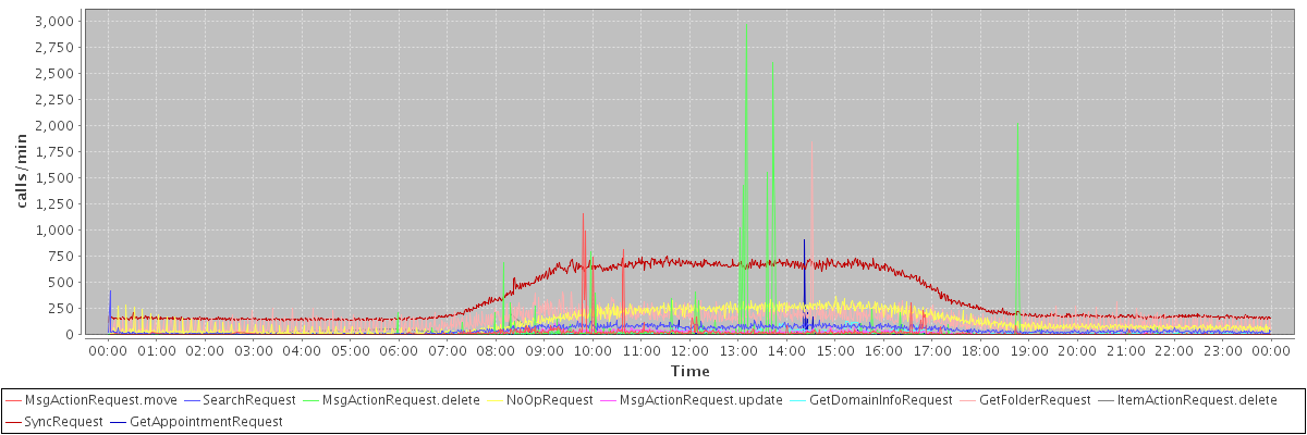 max(MsgActionRequest.move) = 1162.00 max(SearchRequest) = 419.00 max(MsgActionRequest.delete) = 2976.00 max(NoOpRequest) = 379.00 max(MsgActionRequest.update) = 115.00 max(GetDomainInfoRequest) = 129.00 max(GetFolderRequest) = 1844.00 max(ItemActionRequest.delete) = 202.00 max(SyncRequest) = 755.00 max(GetAppointmentRequest) = 915.00