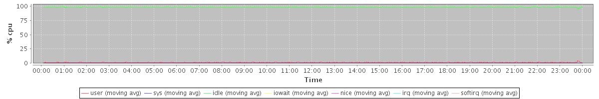 avg(user) = 1.26 avg(sys) = 0.18 avg(idle) = 98.51 avg(iowait) = 0.03 avg(nice) = 0.00 avg(irq) = 0.00 avg(softirq) = 0.00