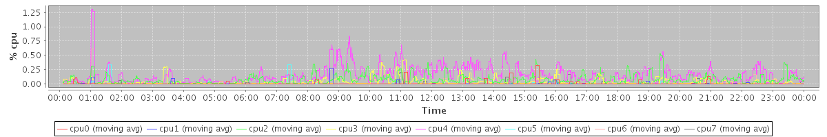 avg(cpu0) = 1.74 avg(cpu1) = 1.41 avg(cpu2) = 1.18 avg(cpu3) = 1.23 avg(cpu4) = 1.08 avg(cpu5) = 1.07 avg(cpu6) = 1.23 avg(cpu7) = 1.11