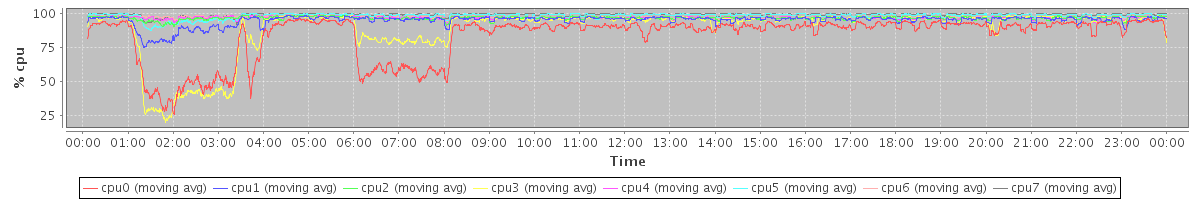 avg(cpu0) = 10.73 avg(cpu1) = 0.97 avg(cpu2) = 0.22 avg(cpu3) = 7.35 avg(cpu4) = 0.12 avg(cpu5) = 0.34 avg(cpu6) = 0.05 avg(cpu7) = 0.13