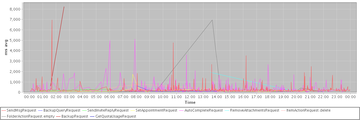 avg(SendMsgRequest) = 257.84 avg(BackupQueryRequest) = 219.40 avg(SendInviteReplyRequest) = 219.00 avg(SetAppointmentRequest) = 228.26 avg(AutoCompleteRequest) = 361.14 avg(RemoveAttachmentsRequest) = 1013.50 avg(ItemActionRequest.delete) = 267.33 avg(FolderActionRequest.empty) = 763.00 avg(BackupRequest) = 4425.50 avg(GetQuotaUsageRequest) = 2740.00
