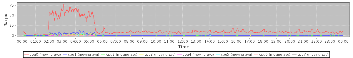 avg(cpu0) = 15.02 avg(cpu1) = 1.02 avg(cpu2) = 0.25 avg(cpu3) = 0.45 avg(cpu4) = 0.13 avg(cpu5) = 0.23 avg(cpu6) = 0.04 avg(cpu7) = 0.37