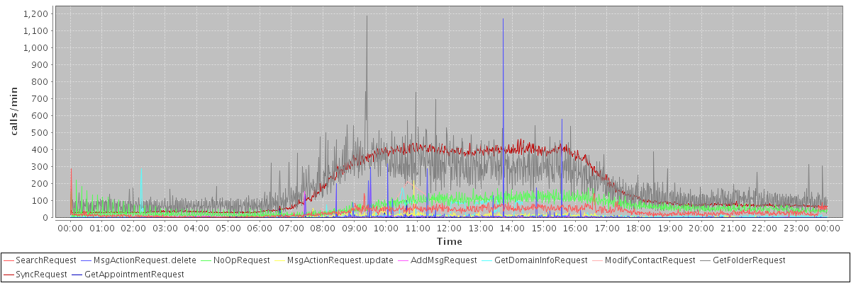 max(SearchRequest) = 290.00 max(MsgActionRequest.delete) = 1171.00 max(NoOpRequest) = 222.00 max(MsgActionRequest.update) = 216.00 max(AddMsgRequest) = 209.00 max(GetDomainInfoRequest) = 287.00 max(ModifyContactRequest) = 212.00 max(GetFolderRequest) = 1188.00 max(SyncRequest) = 465.00 max(GetAppointmentRequest) = 218.00