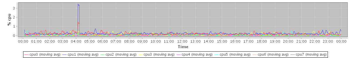 avg(cpu0) = 1.23 avg(cpu1) = 0.89 avg(cpu2) = 0.71 avg(cpu3) = 0.89 avg(cpu4) = 0.73 avg(cpu5) = 0.42 avg(cpu6) = 0.68 avg(cpu7) = 0.31