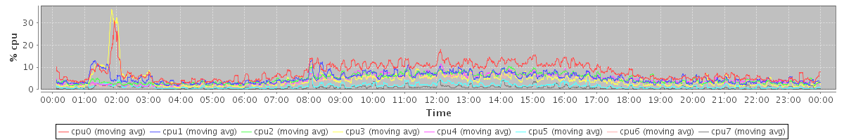avg(cpu0) = 10.28 avg(cpu1) = 1.04 avg(cpu2) = 0.33 avg(cpu3) = 7.02 avg(cpu4) = 0.19 avg(cpu5) = 0.33 avg(cpu6) = 0.12 avg(cpu7) = 0.11