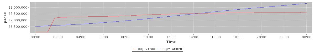 avg(pages read) = 27374268.98 avg(pages written) = 27337927.82