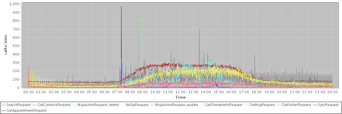 max(SearchRequest) = 260.00 max(GetContactsRequest) = 348.00 max(MsgActionRequest.delete) = 855.00 max(NoOpRequest) = 283.00 max(MsgActionRequest.update) = 609.00 max(GetDomainInfoRequest) = 341.00 max(GetMsgRequest) = 376.00 max(GetFolderRequest) = 700.00 max(SyncRequest) = 309.00 max(GetAppointmentRequest) = 972.00