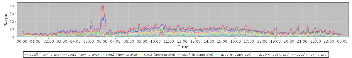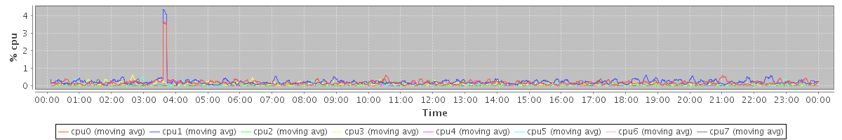 avg(cpu0) = 0.35 avg(cpu1) = 0.26 avg(cpu2) = 0.24 avg(cpu3) = 0.16 avg(cpu4) = 0.19 avg(cpu5) = 0.07 avg(cpu6) = 0.08 avg(cpu7) = 0.03