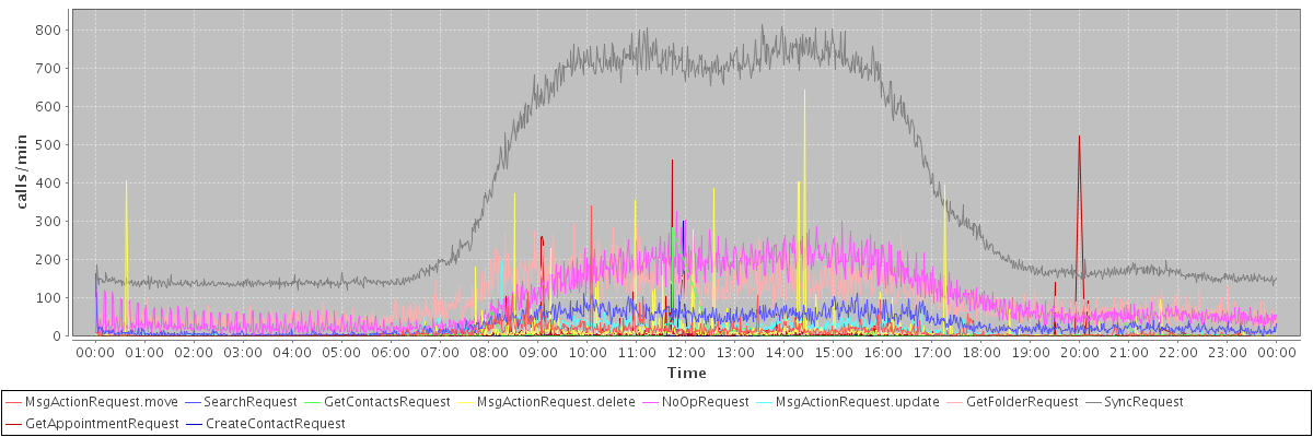 max(MsgActionRequest.move) = 341.00 max(SearchRequest) = 164.00 max(GetContactsRequest) = 285.00 max(MsgActionRequest.delete) = 644.00 max(NoOpRequest) = 326.00 max(MsgActionRequest.update) = 196.00 max(GetFolderRequest) = 292.00 max(SyncRequest) = 816.00 max(GetAppointmentRequest) = 525.00 max(CreateContactRequest) = 301.00