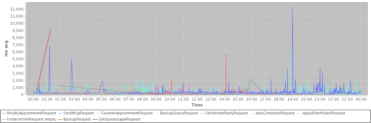 avg(ModifyAppointmentRequest) = 226.50 avg(SendMsgRequest) = 316.23 avg(CounterAppointmentRequest) = 535.00 avg(BackupQueryRequest) = 284.00 avg(SendInviteReplyRequest) = 381.86 avg(AutoCompleteRequest) = 303.82 avg(ApplyFilterRulesRequest) = 2673.50 avg(FolderActionRequest.empty) = 273.39 avg(BackupRequest) = 4913.00 avg(GetQuotaUsageRequest) = 1192.00